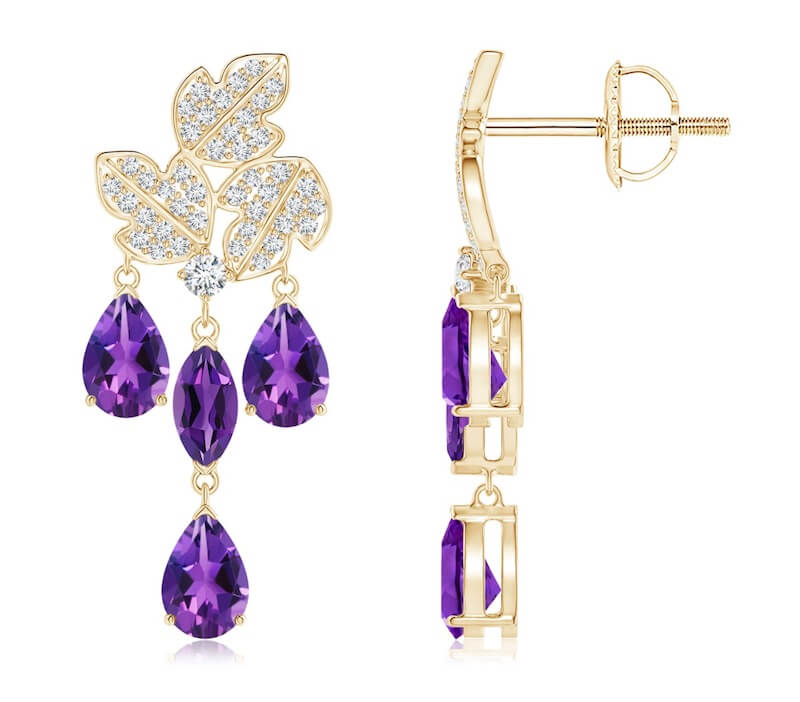 Amethyst, with its twilight depth, belongs to the woman who lingers after the waltz. Angara’s Pear and Marquise Amethyst Grapevine Earrings cascade like sculpted vines from a conservatory ceiling, dramatic yet impeccably refined. They frame the face with a richness that feels both romantic and faintly rebellious, a jewel for the Bridgerton heroine who writes her own ending.
