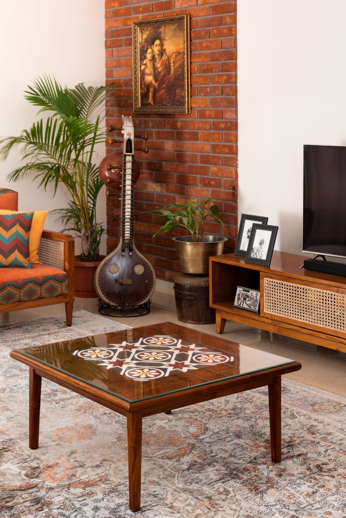The Ramaniyam Center Table, crafted from Teak Wood and tile inlay, is designed to fit seamlessly into any space. The addition of colourful hand-laid tiles on the tabletop adds a pop of colour to this otherwise minimal piece of furniture.