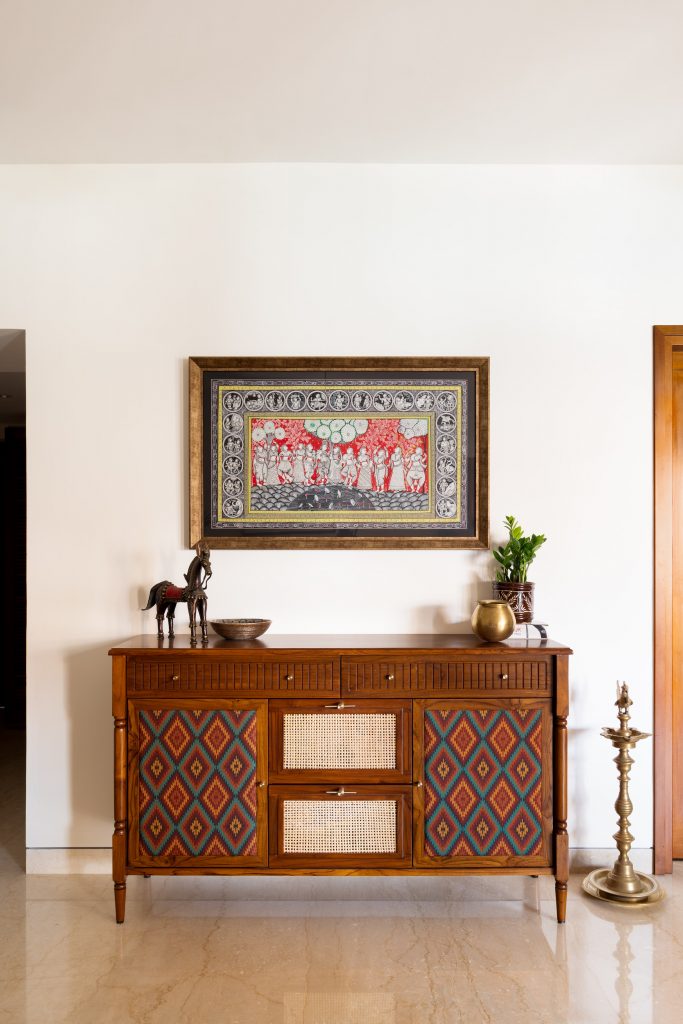 The Ramaniyam Console Unit is designed for multipurpose storage solutions, blending traditional elegance with practicality. Crafted from teak wood, rattan, fabric inlay, and brass knobs, it features ornate legs for a classic touch. The shutters are enhanced with vibrant fabric inlays, and the two drawers are adorned with woven rattan. The top drawers are accented with grooved wooden facia, while the brass knobs add a touch of sophistication to the entire unit.