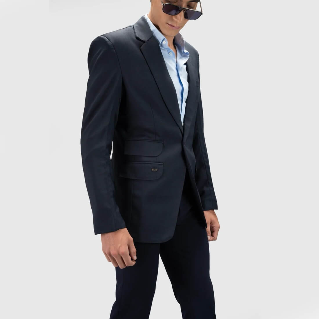 Description: A contemporary navy blazer crafted in a poly-blend fabric, offering a relaxed fit that transitions seamlessly from work to social settings.
