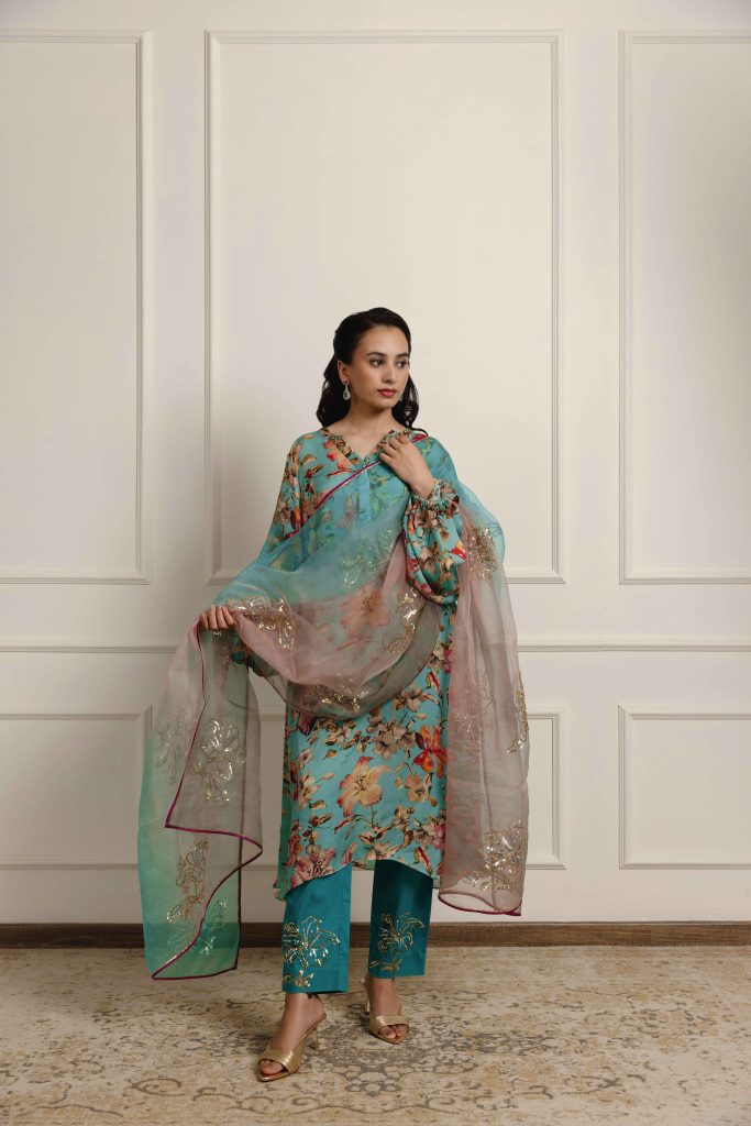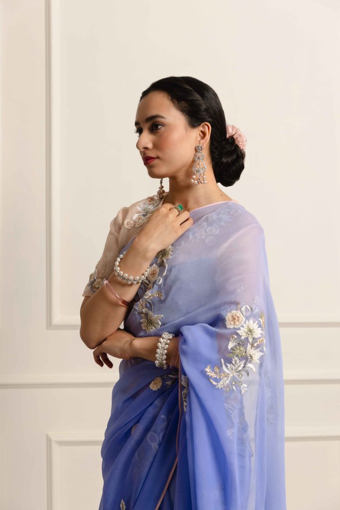 In-house techniques like ombré silk floss and chantilly lace add a touch of Marie Antoinette’s classic charm. Delicate blouses in silk satin and lace complement the sarees, while the salwar kameez sets include diaphanous dupattas and poplin pants embellished with sequins and diamantés.