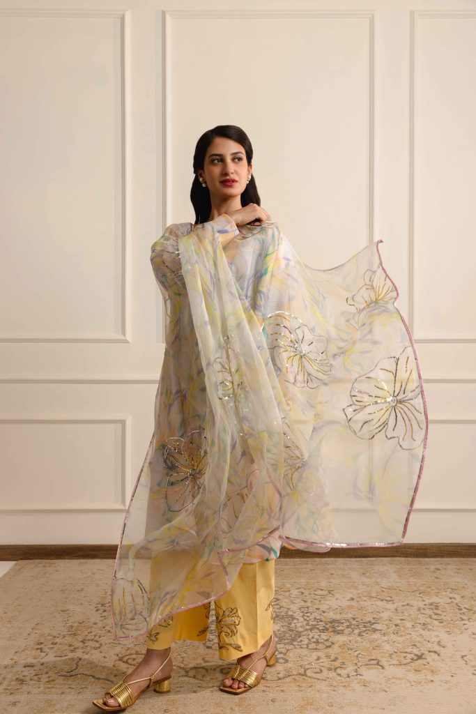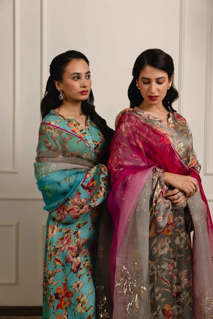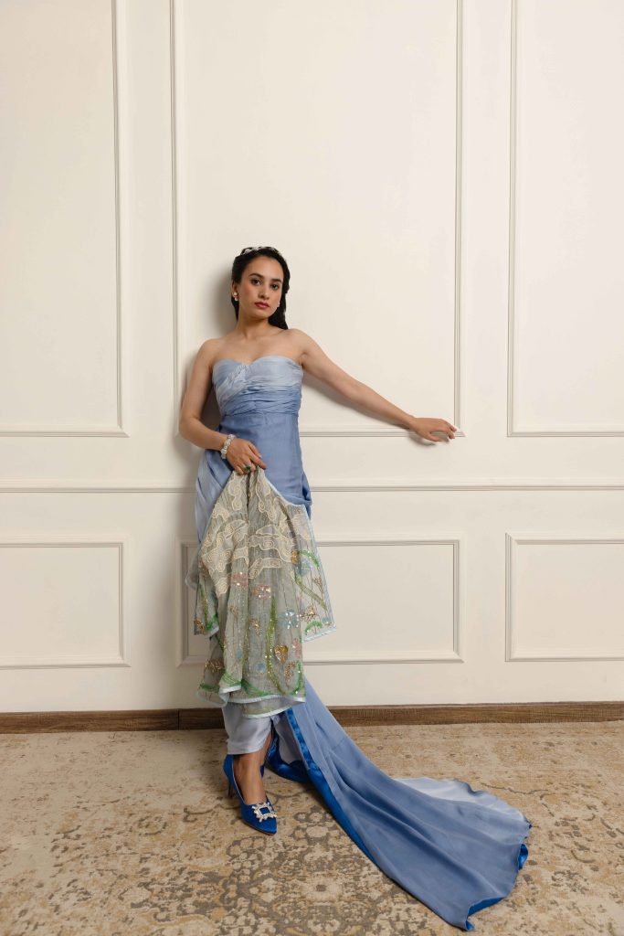 Inspired by the intimate boudoir of Maayankraj Singh’s grandmother, each piece reflects a life of grace and beauty. The palette is a harmonious mix of Rouge, Blush Pink, Sweet Lemons, Inky Blue, and Azure Teal, paired with Indian hues like Khaki, Gulkand, Sona, and Haldi, creating a soft, feminine allure. Luxurious fabrics such as silk satins, French organzas, cotton poplin, and silk chiffons from Lyons highlight the brand’s dedication to craftsmanship. The collection features meticulous garment construction, ensuring even the most delicate drapes have couture foundation garments for structure.