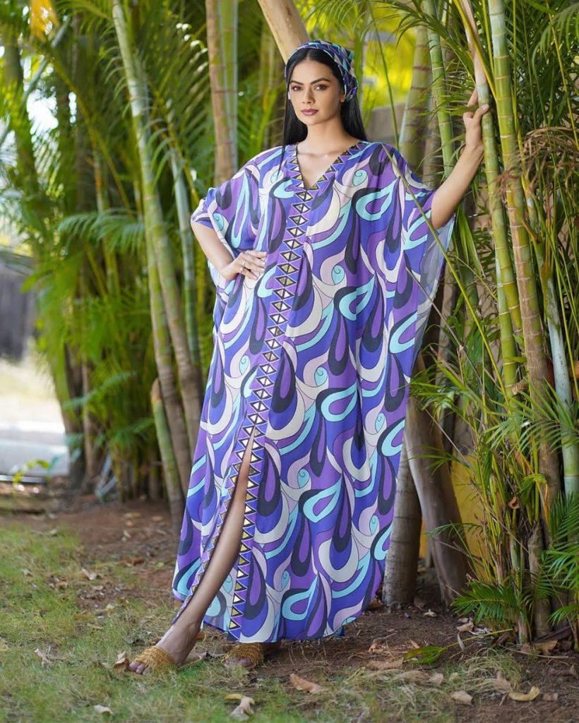 Bathed in your favorite shade of blue, this long kaftan dress made from soft crepe fabric is the perfect vacation companion. Its one-size-fits-all design ensures a relaxed, comfortable fit for beach days or laid-back evenings. Lightweight and effortless, it’s a versatile piece that takes you from daytime relaxation to evening.