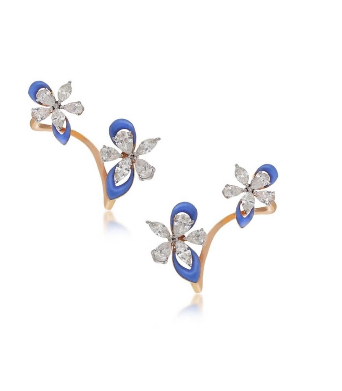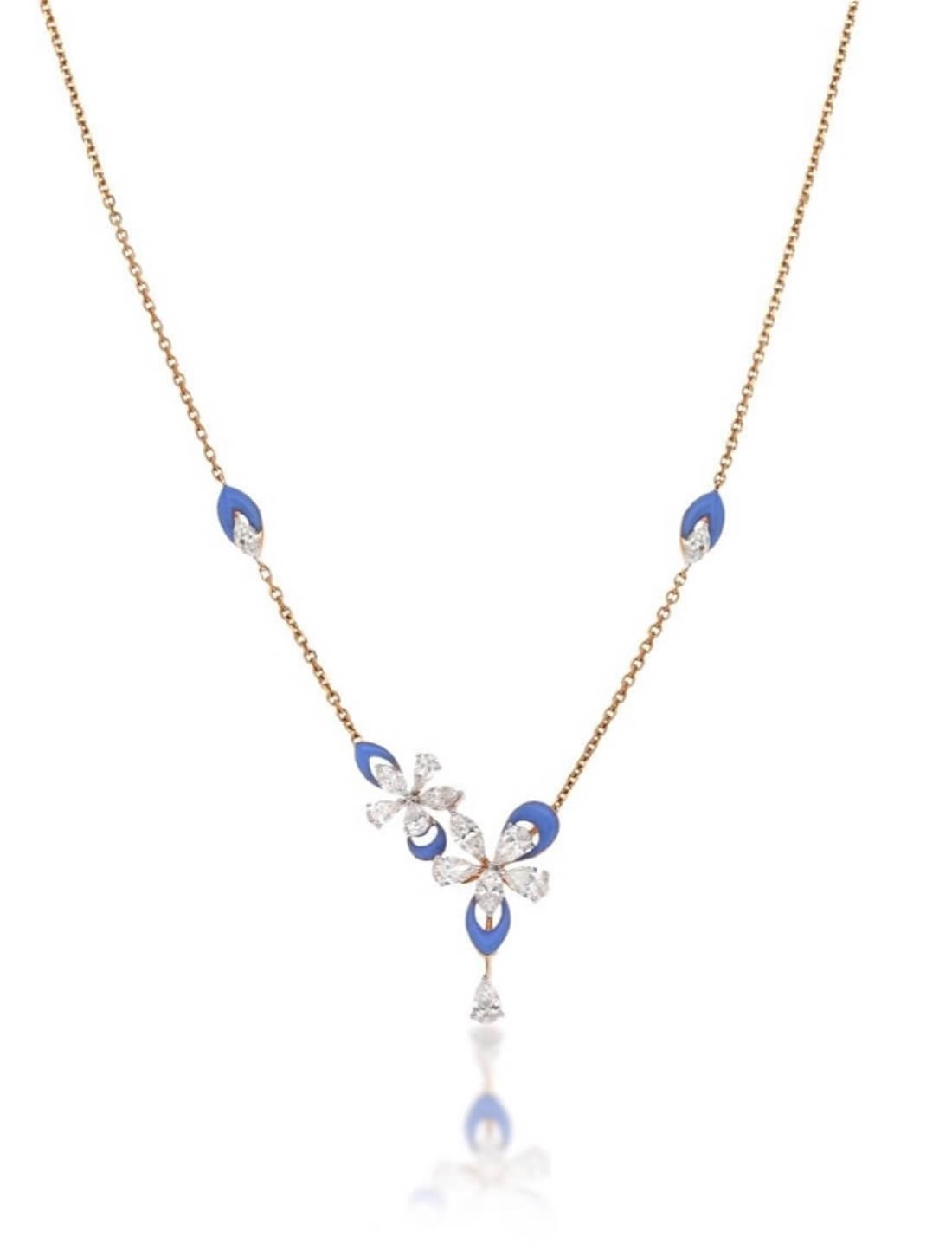 Description: This elegant jewellery set in 18kt gold with rose gold polish makes a timeless Valentine’s Day gifting choice. Adorned with handcrafted meenakari, natural diamonds, and delicate blue enamel accents inspired by floral motifs, it beautifully blends traditional artistry with modern elegance. Perfect for both everyday refinement and special moments, it’s a meaningful expression of love and craftsmanship.