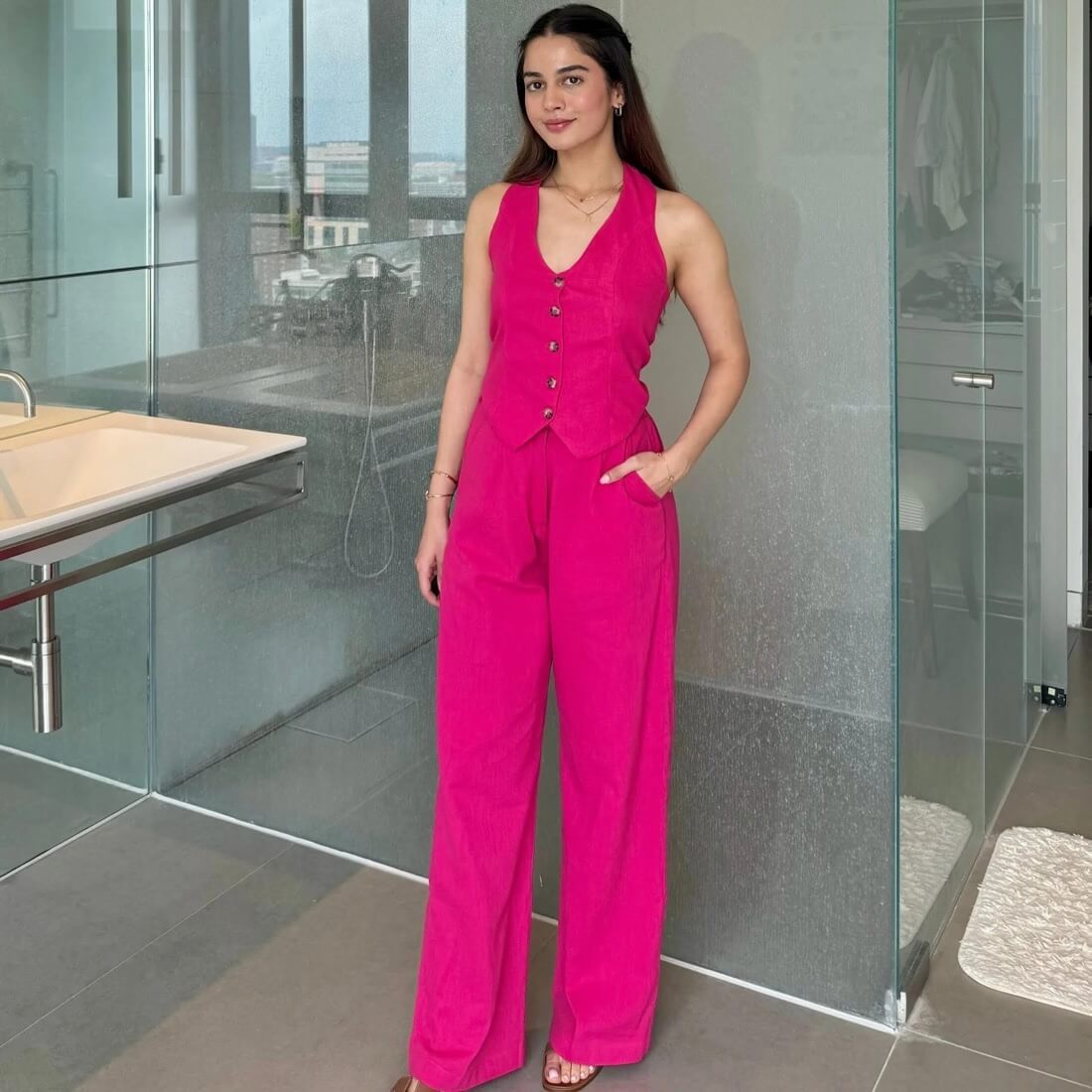 Description: The Geneva Set in vibrant hot pink is a bold and playful co-ord set perfect for Valentine’s Day gifting. With its flattering halter neck vest, buttoned front, and adjustable back buckle paired with high-waisted straight-fit pants, the set offers a confident yet romantic silhouette. Designed to feel special, it makes an ideal gift for date nights, parties, or memorable Valentine’s Day moments.