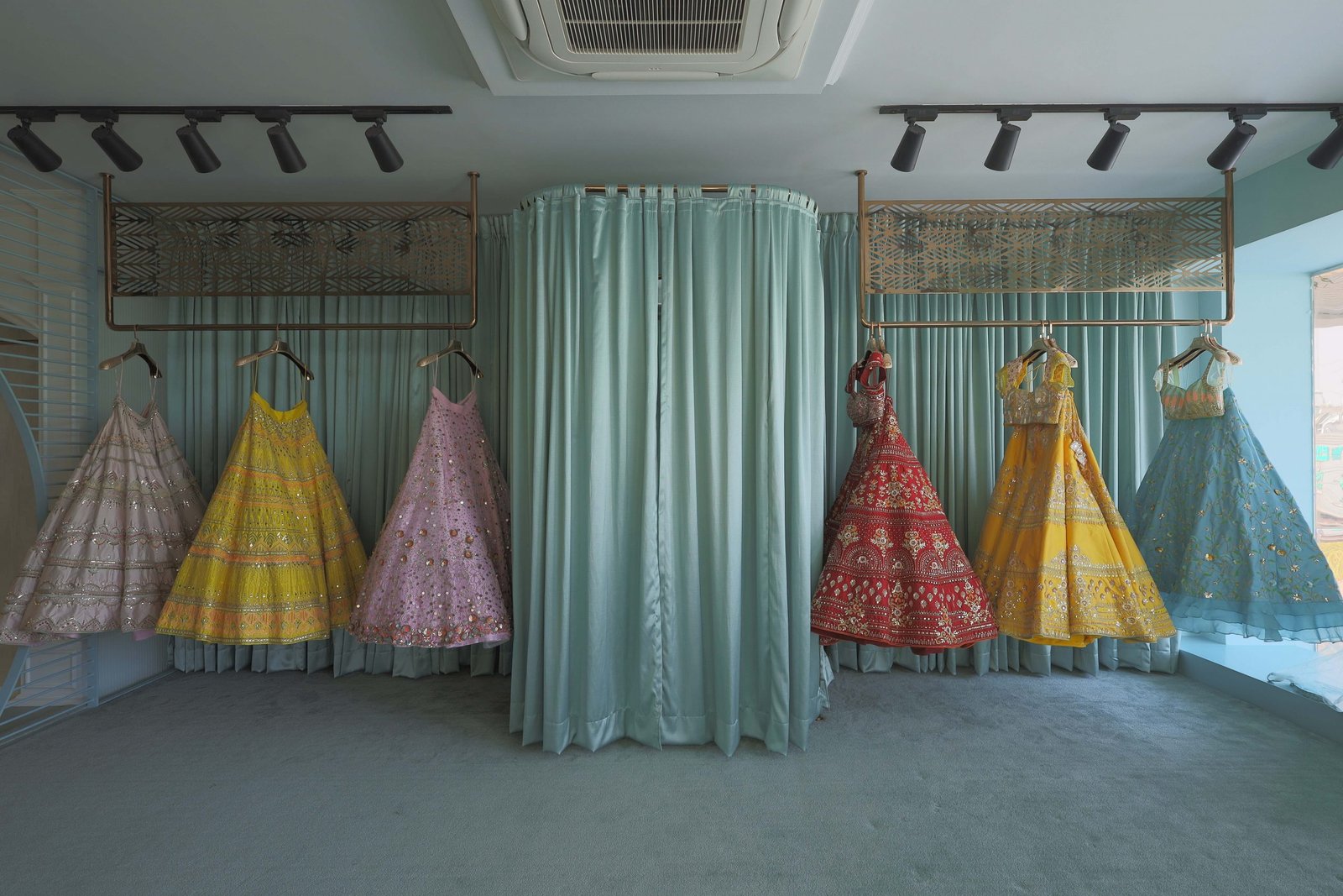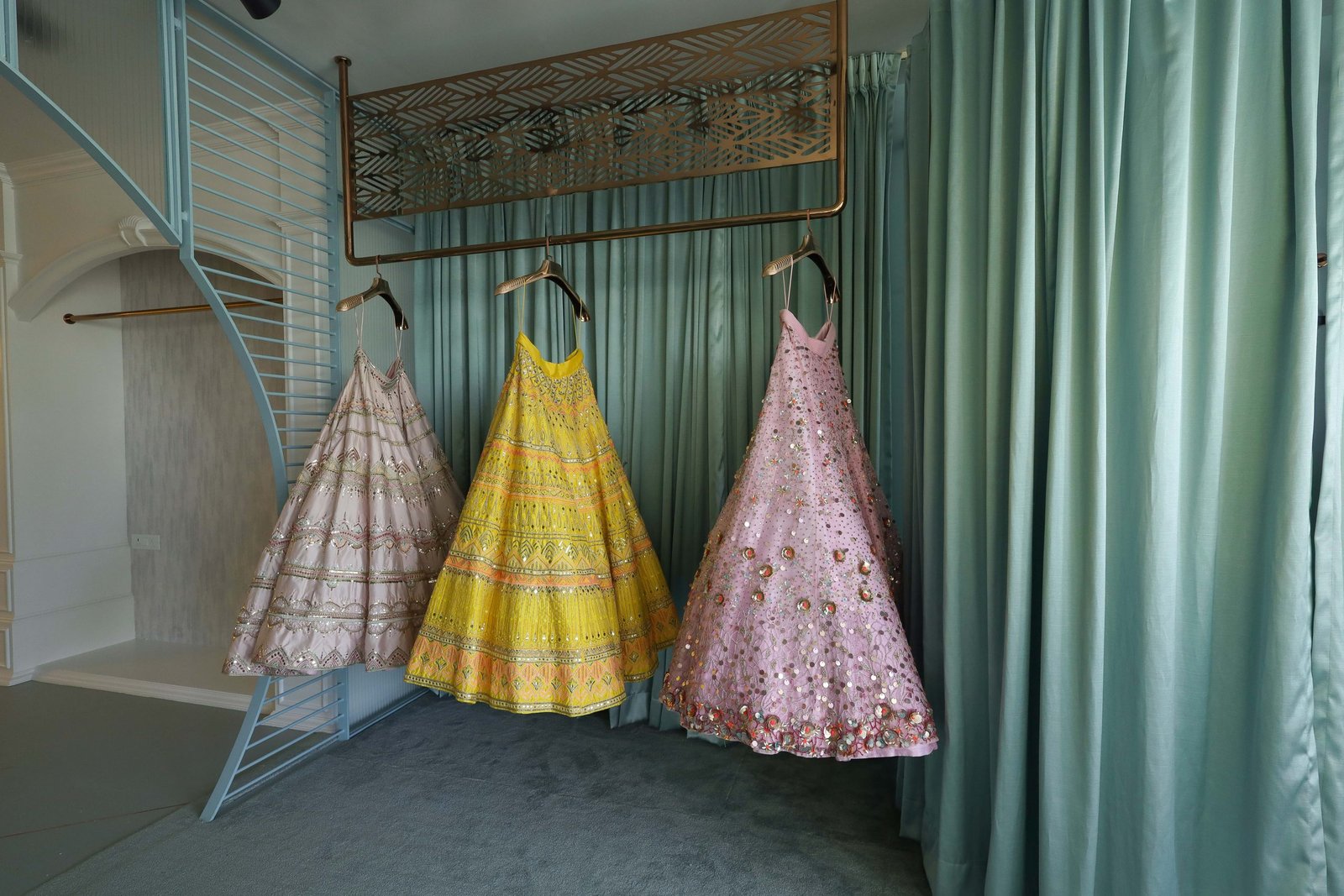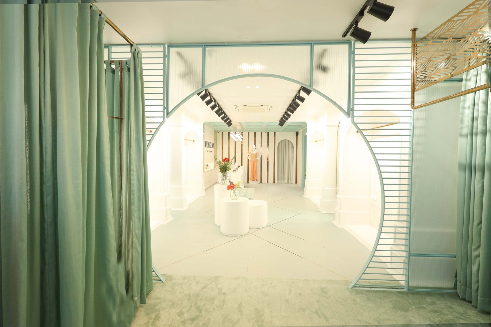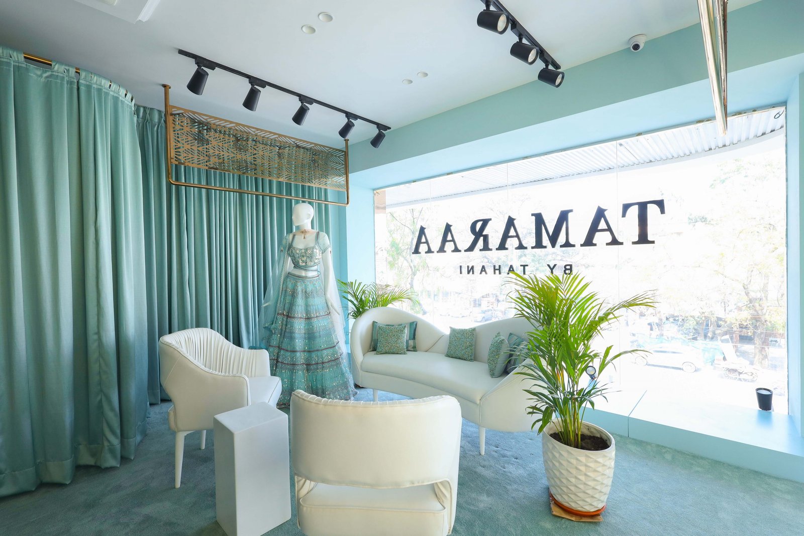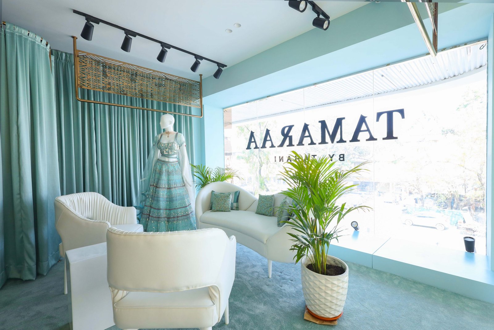 The Tamaraa by Tahani store would also be Indore’s first designer store, the perfect luxury destination for patrons to find their dream outfits whether it be traditional, modern or contemporary. With a beautiful domed entry to the space, the entire ambiance is aimed to be calm and serene, creating a peaceful yet dynamic environment. The floors have geometric patterns that flawlessly contrast the accent wall with statement embroidery – a representation of the brand’s technical finesse and potential. Adding to the nature-inspired decor, the mood lighting elevates the ambiance even further. The mint and white walls complement the rose gold fixtures, while the floral installations add the natural element most subtly. Neha and Sonam Sahani, the interior designers for the store have fabulously incorporated the abstract elements with the nature-inspired corners of the store giving it a picturesque view.