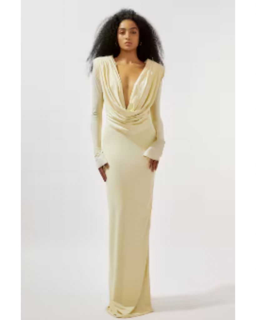 This daring dress features a deep plunging neckline, perfectly balancing elegance and allure. It’s designed to make a bold statement at any event. Price: 21,000