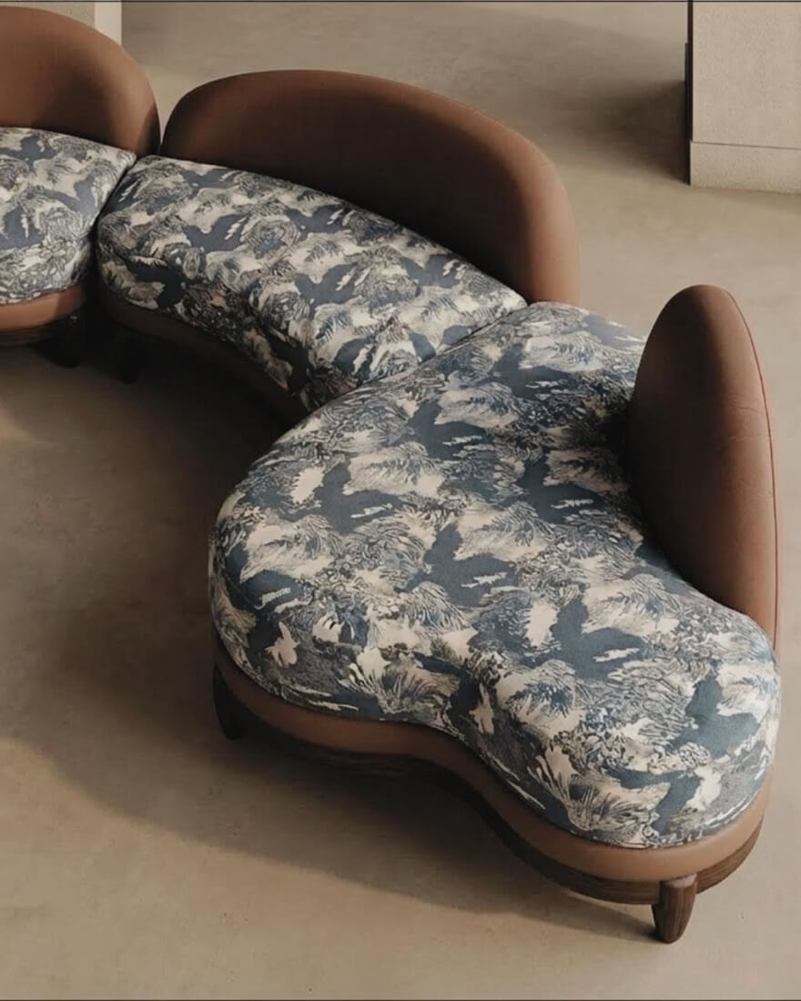 Description: With its iconic serpentine form, the Meander Sectional Sofa stands out for its fluid design and effortless versatility. Designed to blend seamlessly with a range of interior styles, it features a distinctive floral print paired with a rich brown leather back, adding depth and character. Its modular construction allows each seat to be easily rearranged, making it as adaptable as it is visually striking—perfect for dynamic, modern living spaces.