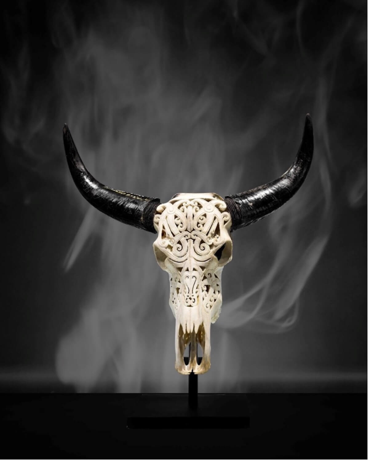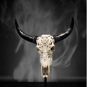 Product Description : Set the perfect eerie tone for Halloween with this intricately carved bull skull. Dark, polished horns and detailed bone engravings give it a mystical, gothic charm. Its haunting design, paired with a smoky, ethereal vibe, makes it an ideal centerpiece or wall decor. Add a touch of spooky elegance to your space with this striking Halloween decoration.