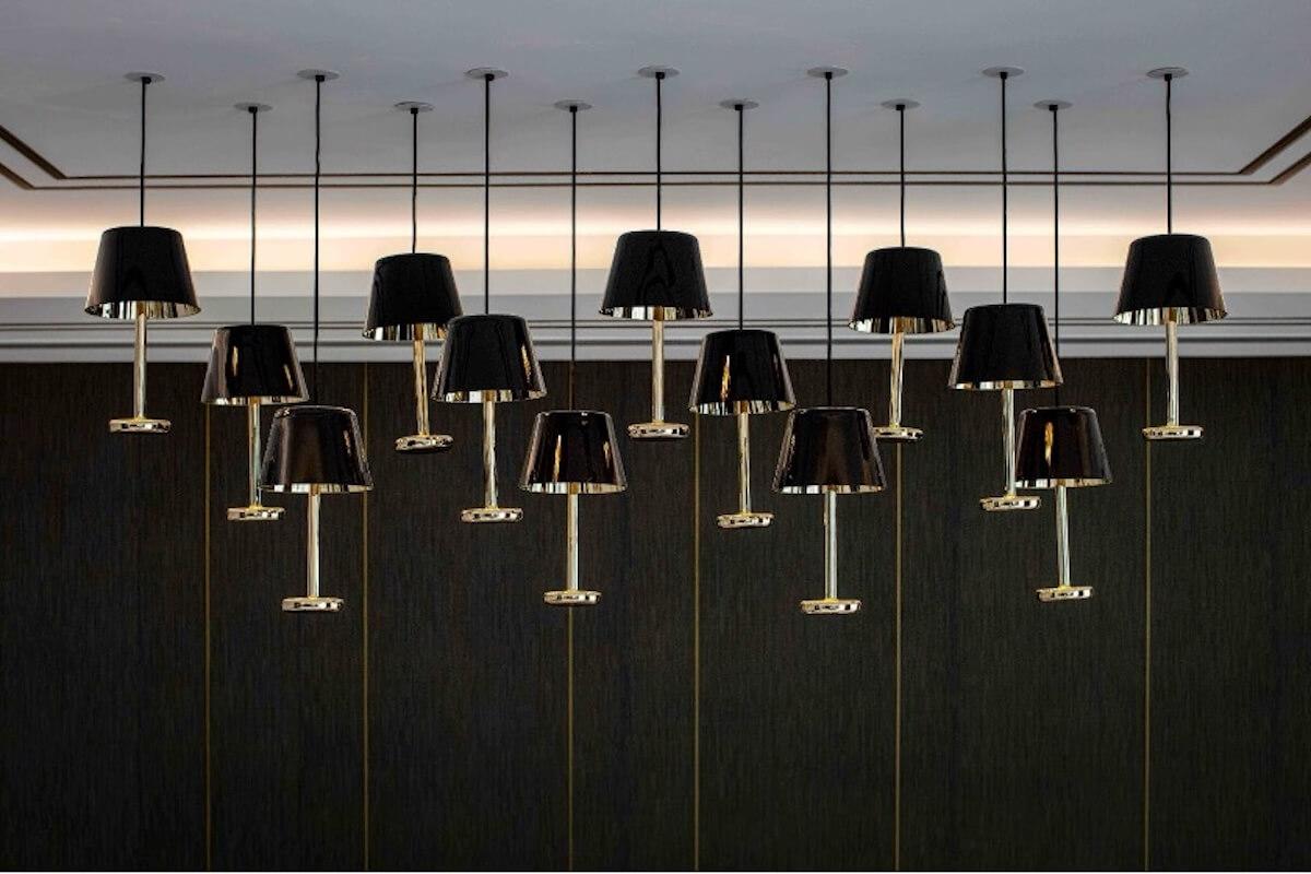 Product Description : These pendant lights, with their minimalistic cords and sleek design, appear to float effortlessly in the air, adding an enchanting and slightly eerie vibe to your Halloween decor. The suspended black lamp shades seem to hover in space, creating the illusion of ghostly floating lamps. The golden hardware beneath each shade gives off a faint glimmer, further enhancing the mysterious, almost supernatural feel. This floating effect evokes imagery of a haunted house where objects move on their own, perfect for setting a spooky yet refined Halloween ambiance.